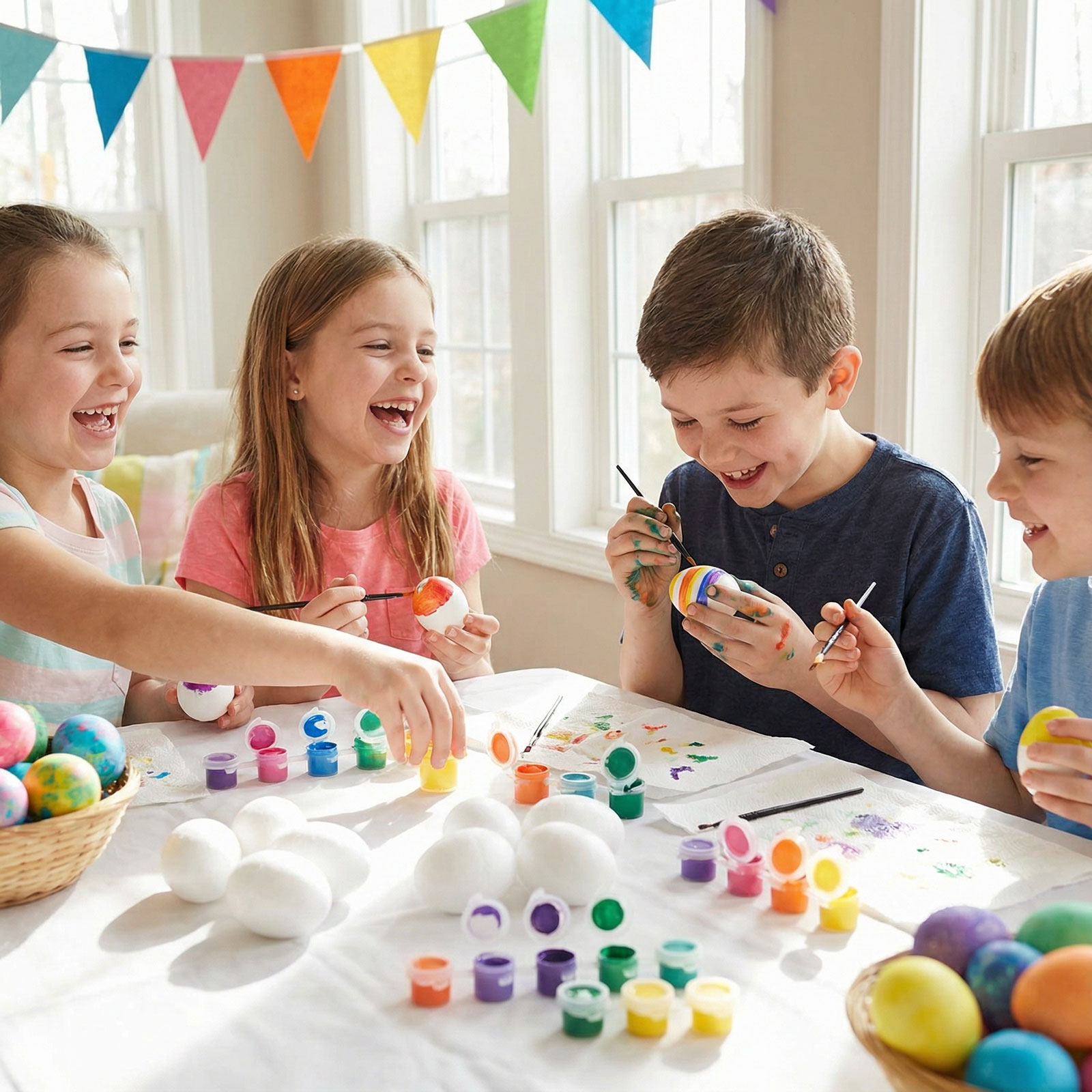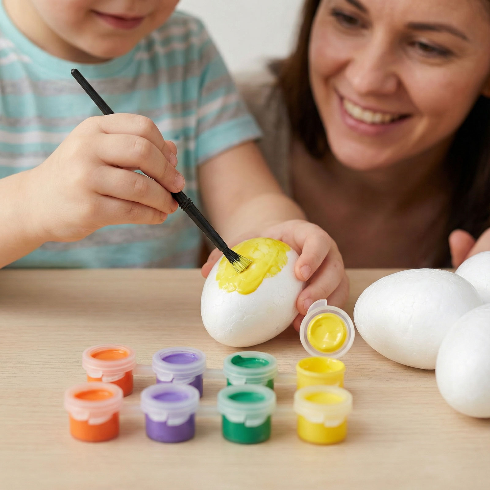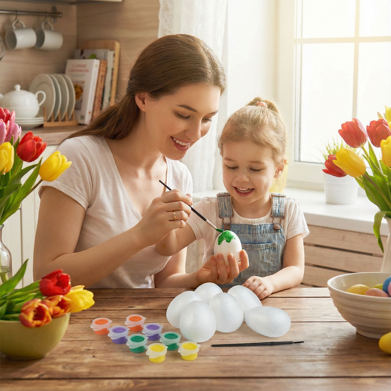 Varázsoljon kreatív húsvéti hangulatot ezzel a színes festőkészlettel! A szett 6 darab fehér habosított tojást tartalmaz, amelyeket saját ízlés szerint dekorálhat. A csomag része egy ecset és 8 különböző színű festék is. Az organza tasak praktikus és dekoratív csomagolást biztosít, így ajándéknak is tökéletes választás. Ideális húsvéti kézműves foglalkozásokhoz, családi programokhoz vagy ünnepi dekoráció készítéséhez.