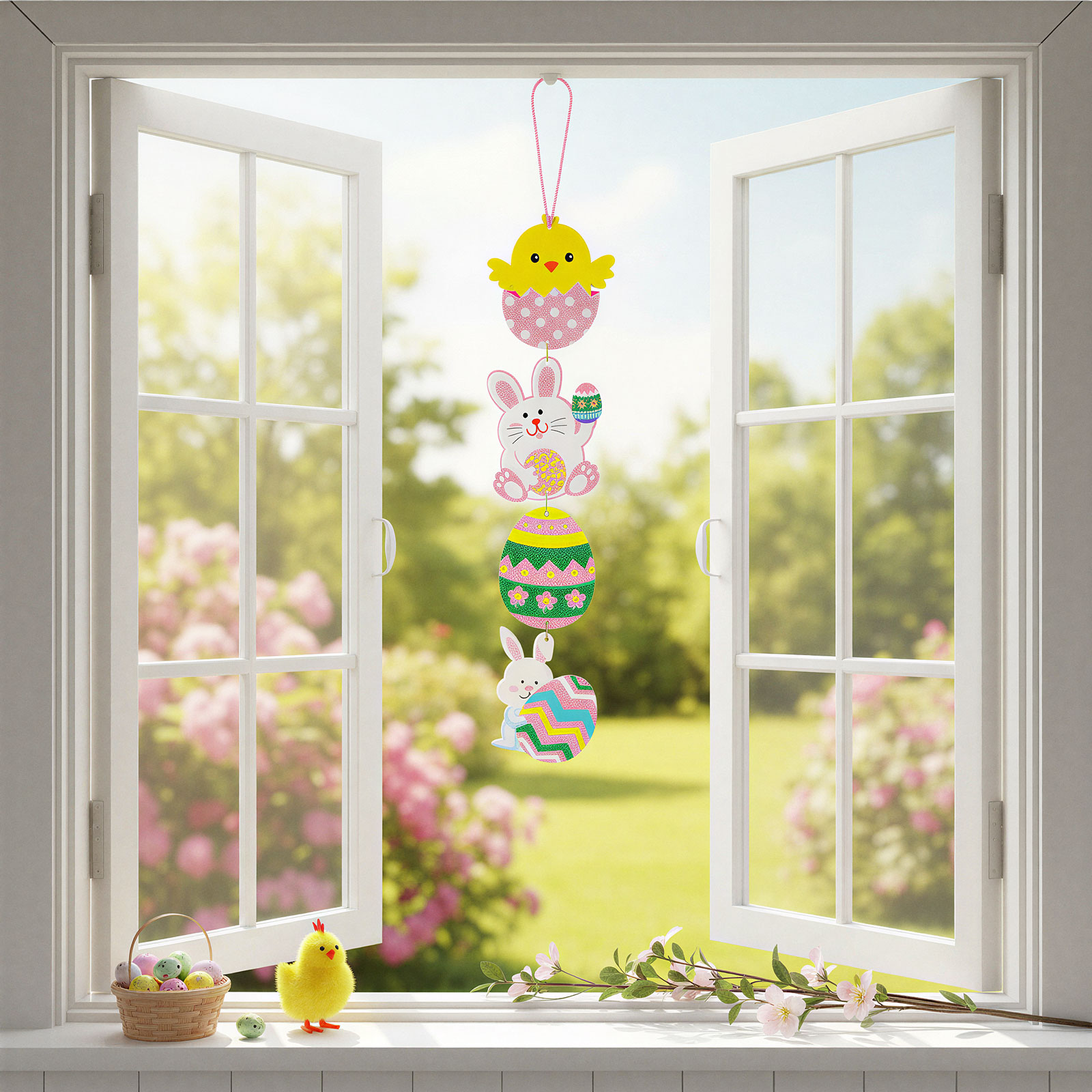 Dobja fel otthonát ezzel a látványos húsvéti függő dekorációval! A csillámos hablemezből készült dísz négy részből áll, amelyek között aranyos nyuszi, csibe és színes húsvéti tojás motívumok találhatók. Vidám színei és csillogó felülete garantáltan ünnepi hangulatot teremt a lakásban. Könnyedén felakasztható ajtóra, ablakra, falra vagy akár gyerekszobába is, és remekül illik bármely húsvéti dekorációs kompozícióhoz.