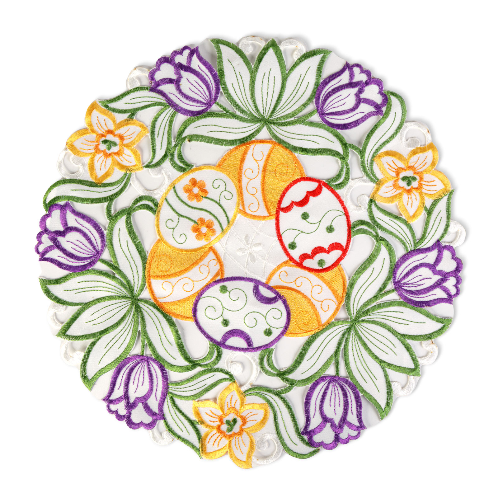 Ez a gyönyörű, hímzett húsvéti alátét különleges ünnepi hangulatot teremt asztalán. A közepén található színes tojásminták és a körben elhelyezett tavaszi virágmotívumok elegáns és vidám megjelenést biztosítanak. A részletgazdag hímzésnek köszönhetően az alátét nemcsak praktikus, hanem dekoratív elemként is tökéletes választás húsvéti terítékéhez.