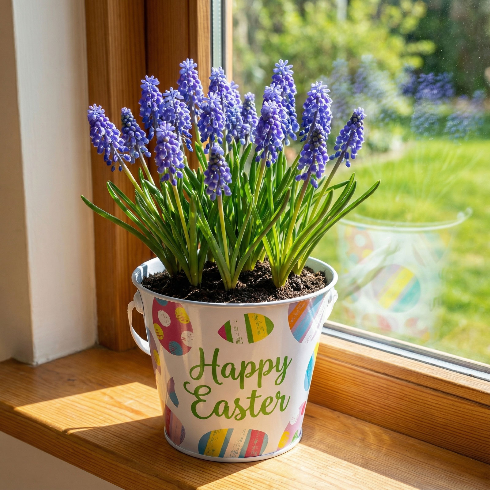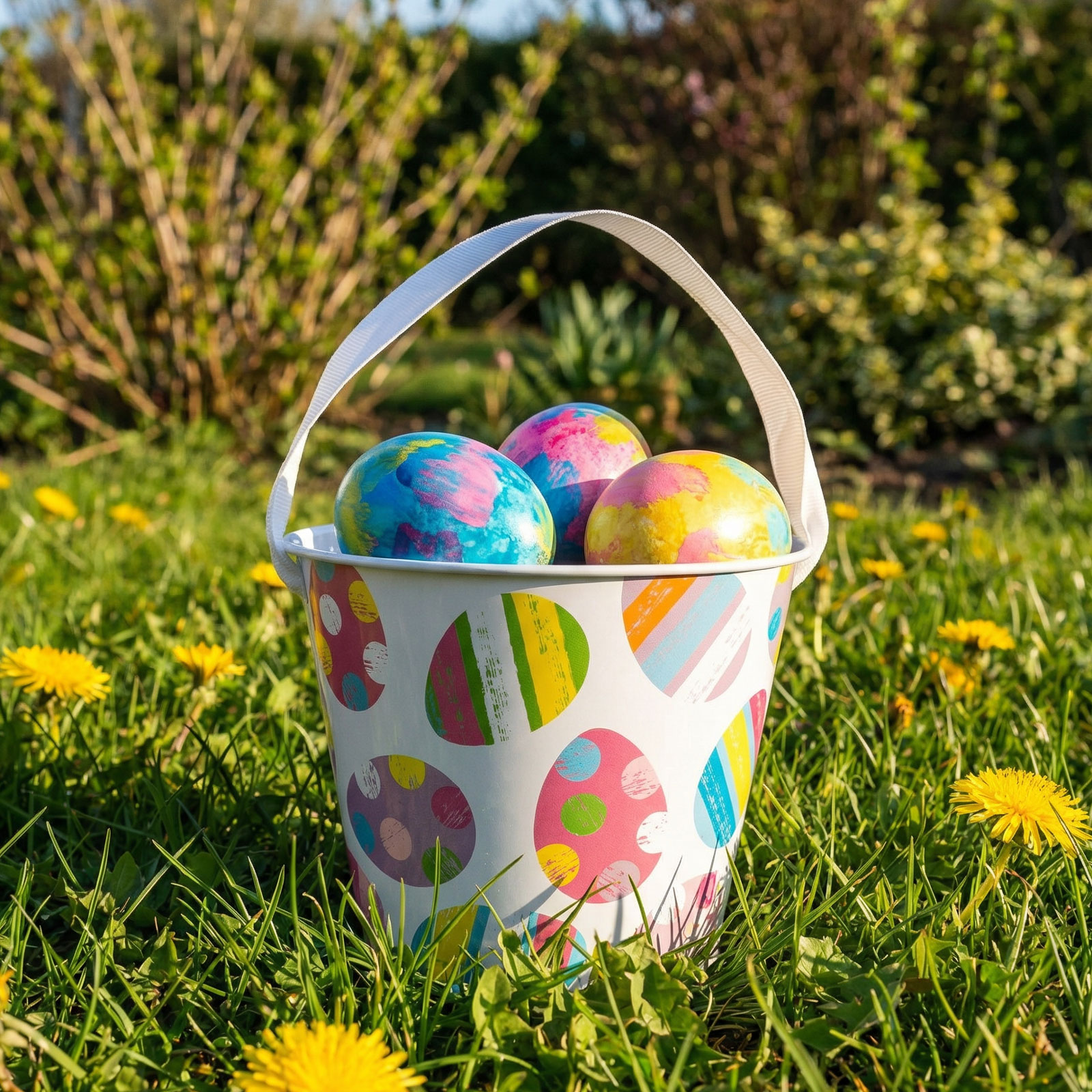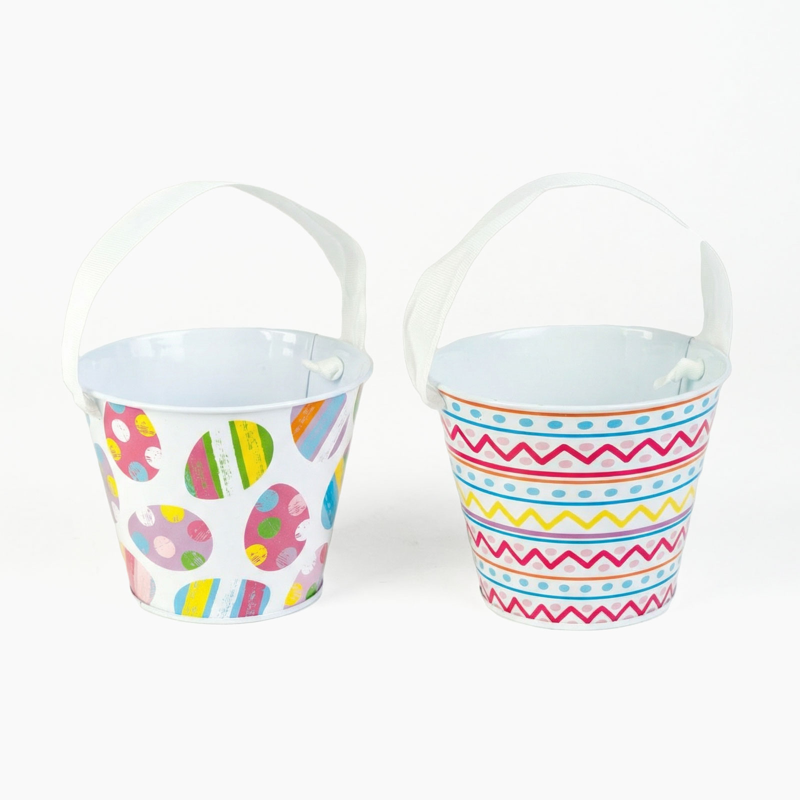 Dobja fel a húsvéti dekorációt ezzel a vidám, mintás fém vödörrel! Szalagos fogantyúval rendelkezik, amely nemcsak praktikus, hanem esztétikus kiegészítője is az ünnepi hangulatnak. Kétféle mintával kapható: színes tojásmintás és geometrikus húsvéti motívumokkal díszített változatban. Ideális apró ajándékok, édességek, tojások tárolására, valamint asztali vagy kompozíciós dekoráció részeként is megállja a helyét.