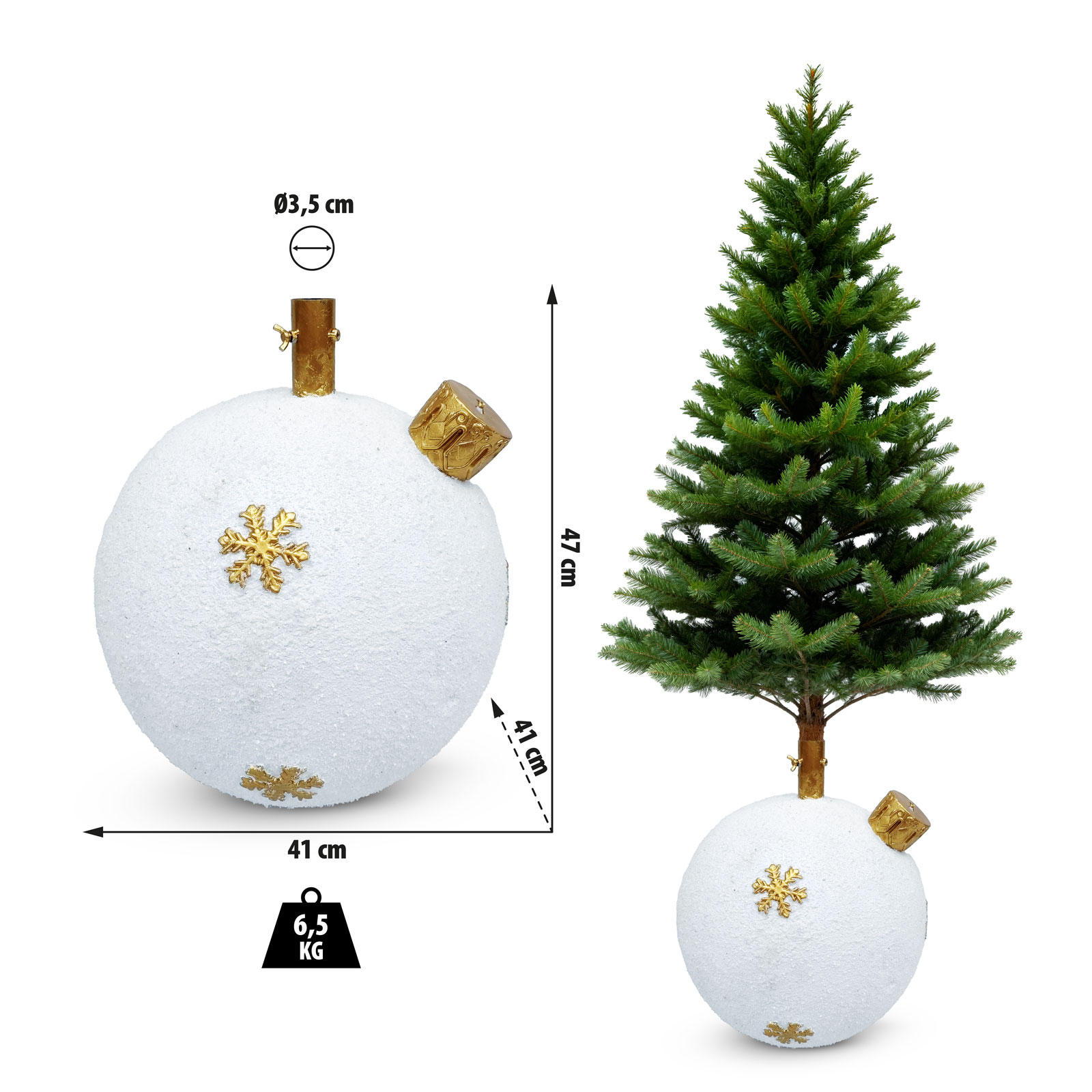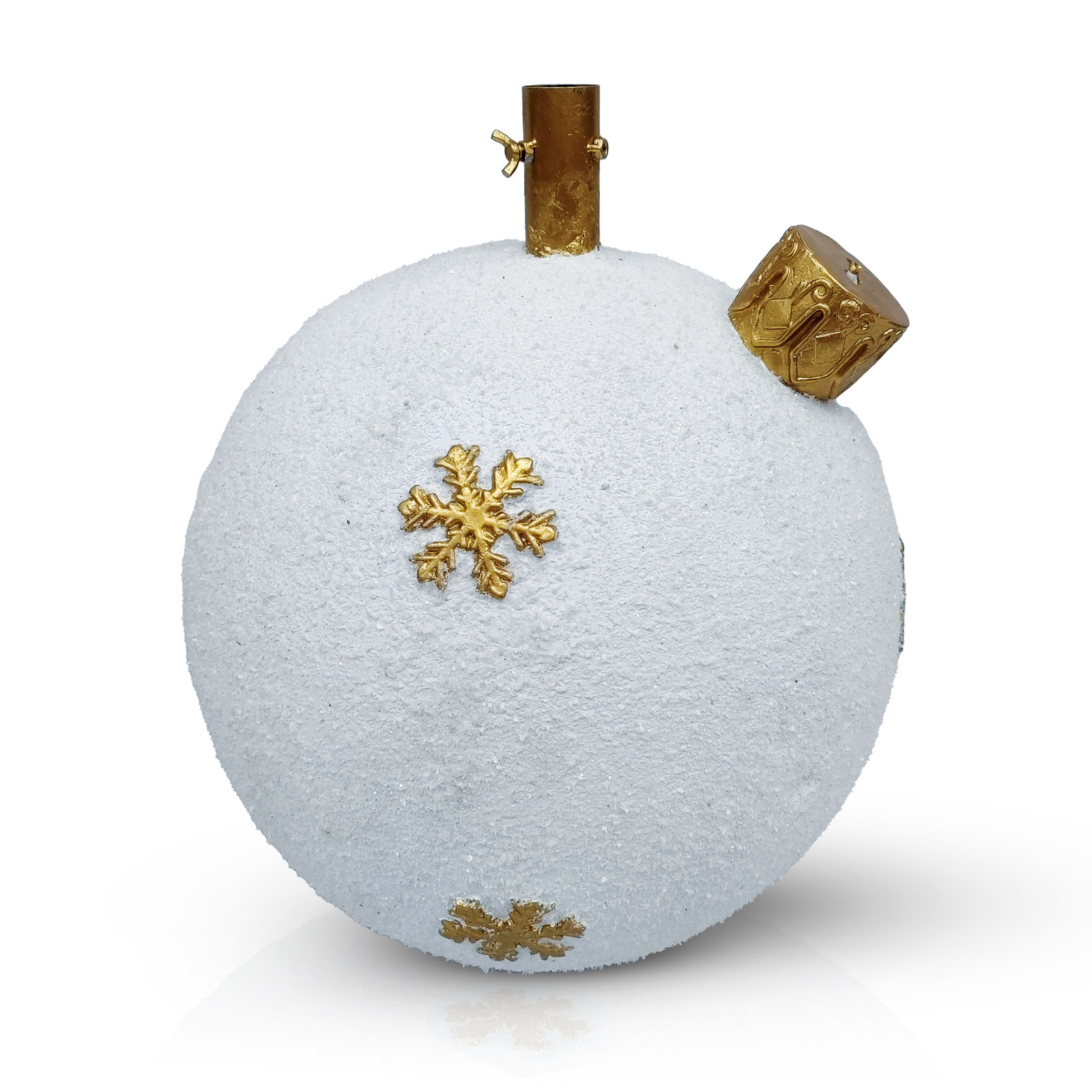 Ez a gömbdísz formájú karácsonyfa talp nemcsak praktikus, de dekoratív eleme is lehet a karácsonyfának. A fehér színű, arany jégkristályokkal díszített gömb élethű karácsonyfadísz benyomását kelti, miközben stabilan tartja a karácsonyfát. A műkőből készült talp erős tartást biztosít nagyobb méretű fák esetén is.
