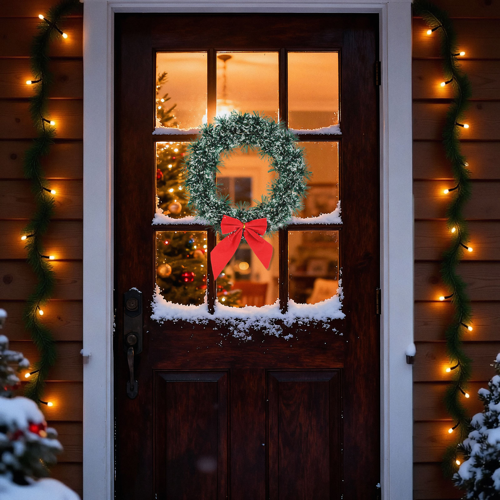 A koszorú alapja erős, vastag műanyag, amelyet zöld, havas hatású girland borít. Ez a koszorú kiváló karácsonyi dekorációs eszköz, piros masival díszített, amely egyedi megjelenést kölcsönöz otthonának. A koszorú további díszekkel dekorálható, mint például gömbdíszek, csengettyűk, izzósorok vagy egyéb kiegészítők. A kiváló anyaghasználatnak köszönhetően több éven keresztül használható.