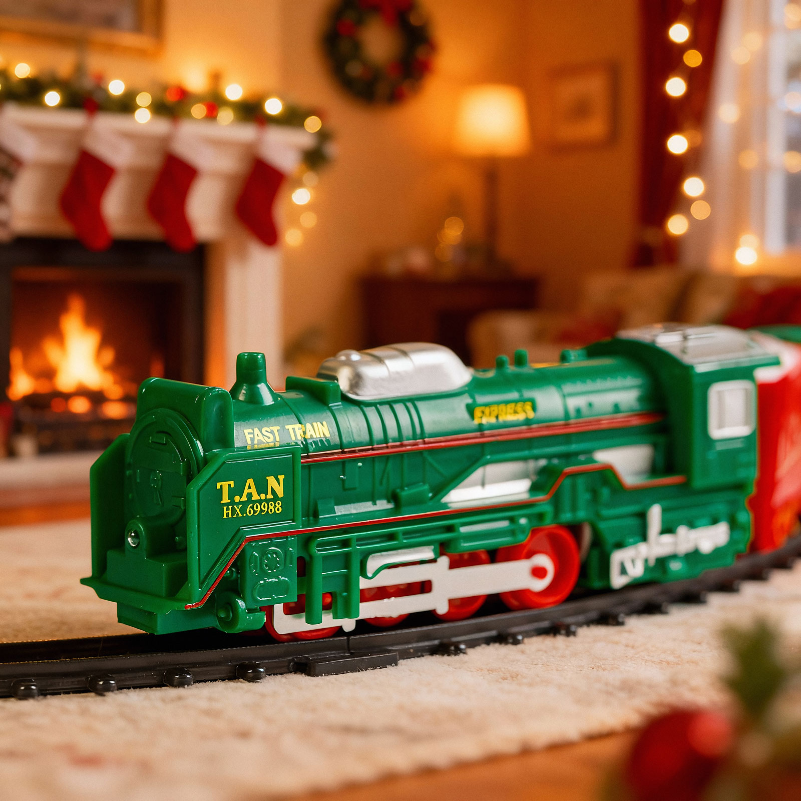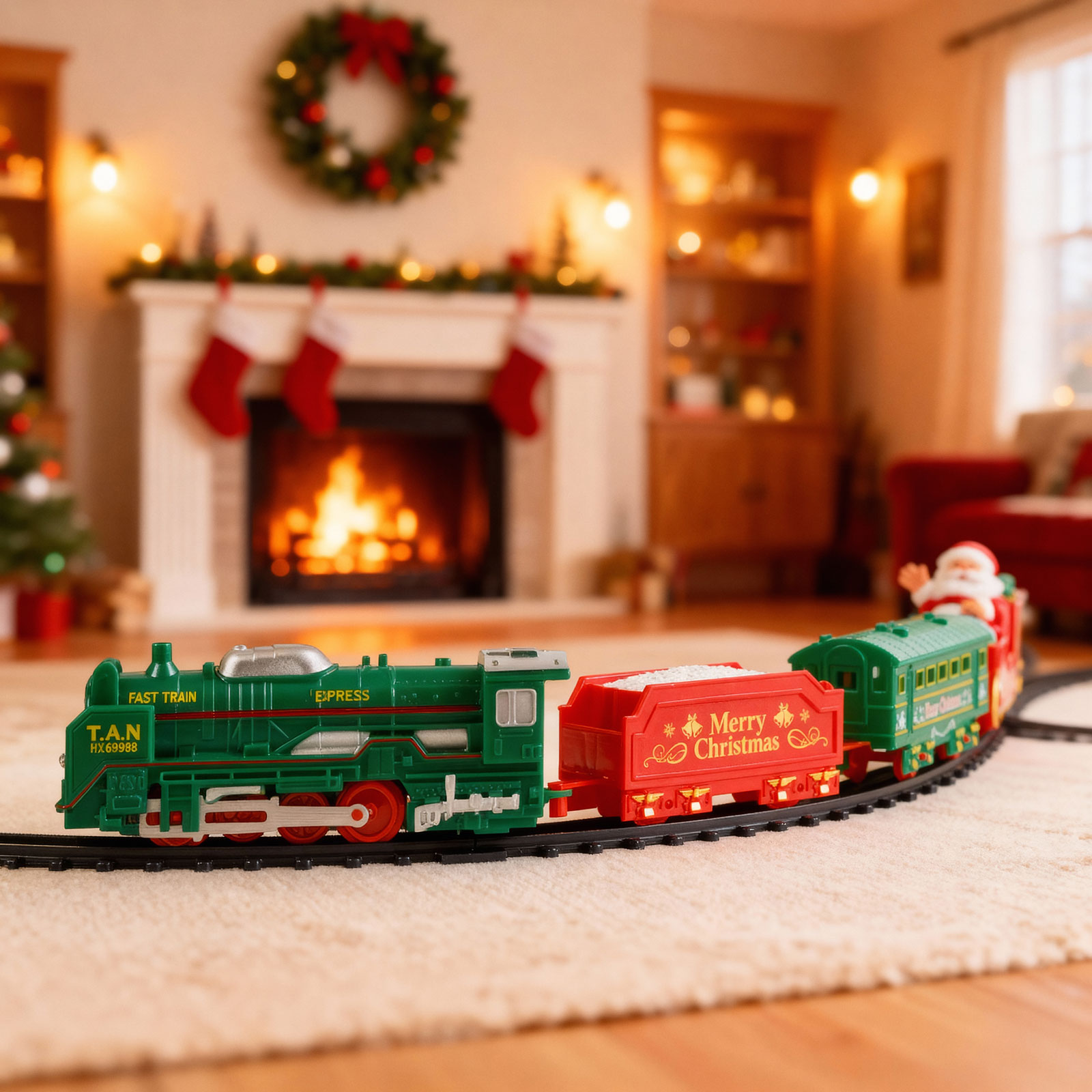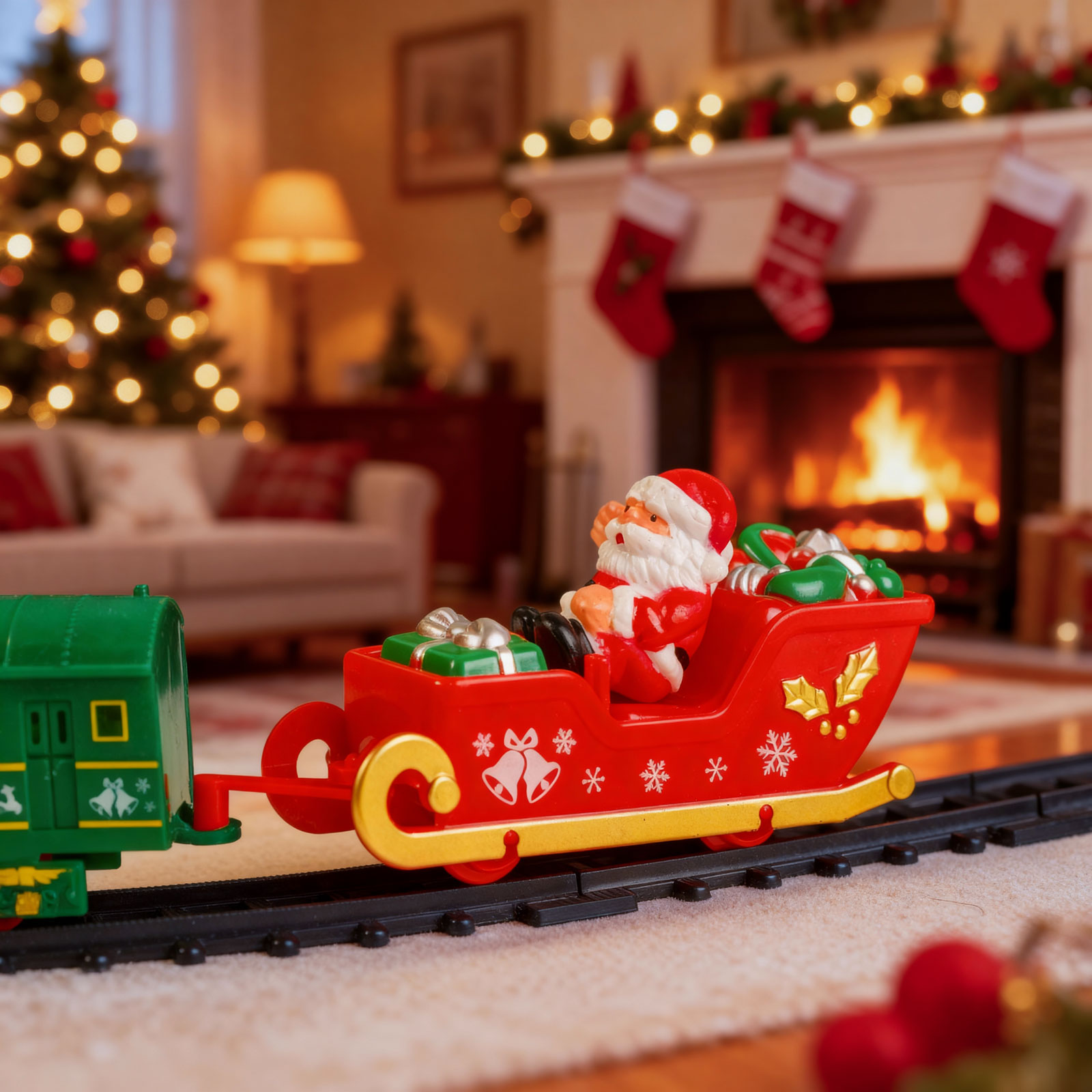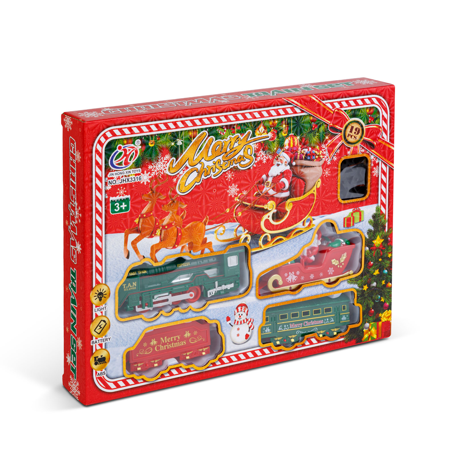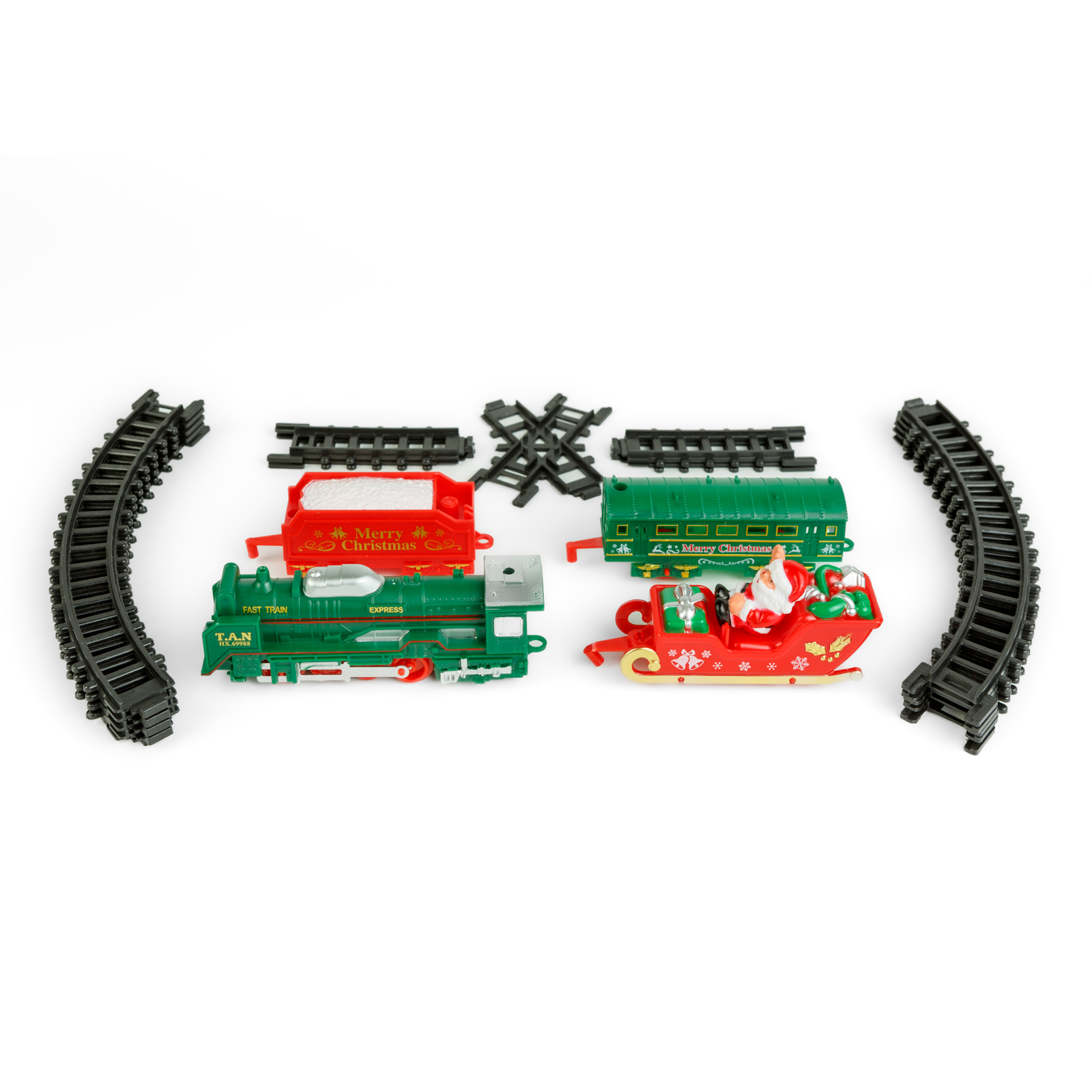 | A készlet tartalma: | 1 mozdony – 13 cm 1 szán Mikulással – 9,5 cm 1 piros színű vagon – 8 cm 1 zöld színű vagon – 10 cm 15 db sín (10 db íves, 4 db rövid, egyenes, 1 db kereszteződés) |