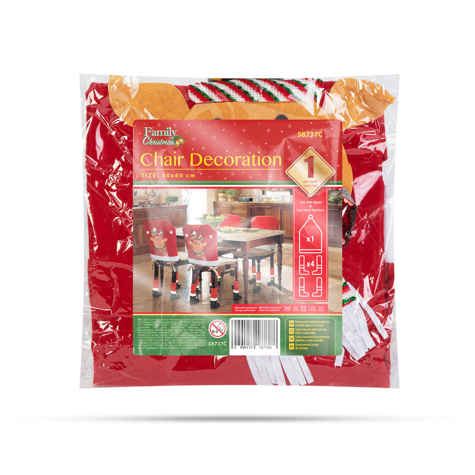 Karácsonyi székdekor szett – Rénszarvas – 50 x 60 cm – piros/fehér Family 58737C