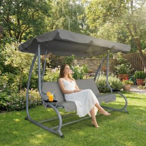 Stabil szerkezetű, stílusos megjelenésű kerti hintaágy akár 3 fő pihenését is garantálja! Ideális választás kertekbe, teraszokra, vagy akár strandokra is! Modern kialakításával és stabil fémszerkezetével garantáltan kiemelkedik majd a kerti bútorok közül. Az időjárásálló kivitelnek köszönhetően a hinta ellenáll az időjárás viszontagságainak, biztosítva hosszú élettartamát.