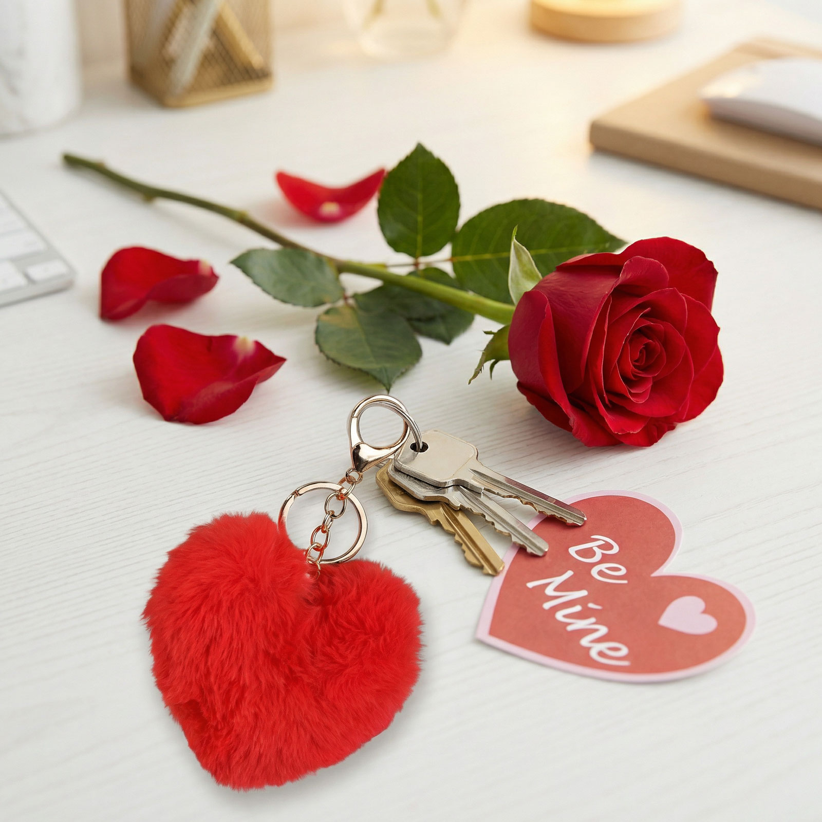 Tegye különlegessé mindennapjait ezzel a piros, szív alakú plüss kulcstartóval! A puha és kellemes tapintású anyagból készült kiegészítő nemcsak praktikus, hanem romantikus és vidám hangulatot is kölcsönöz kulcsainak vagy táskájának. Arany színű karikával és lánccal könnyen rögzíthető, így ideális ajándék lehet szeretteinek Valentin-napra, évfordulóra vagy bármilyen alkalomra.