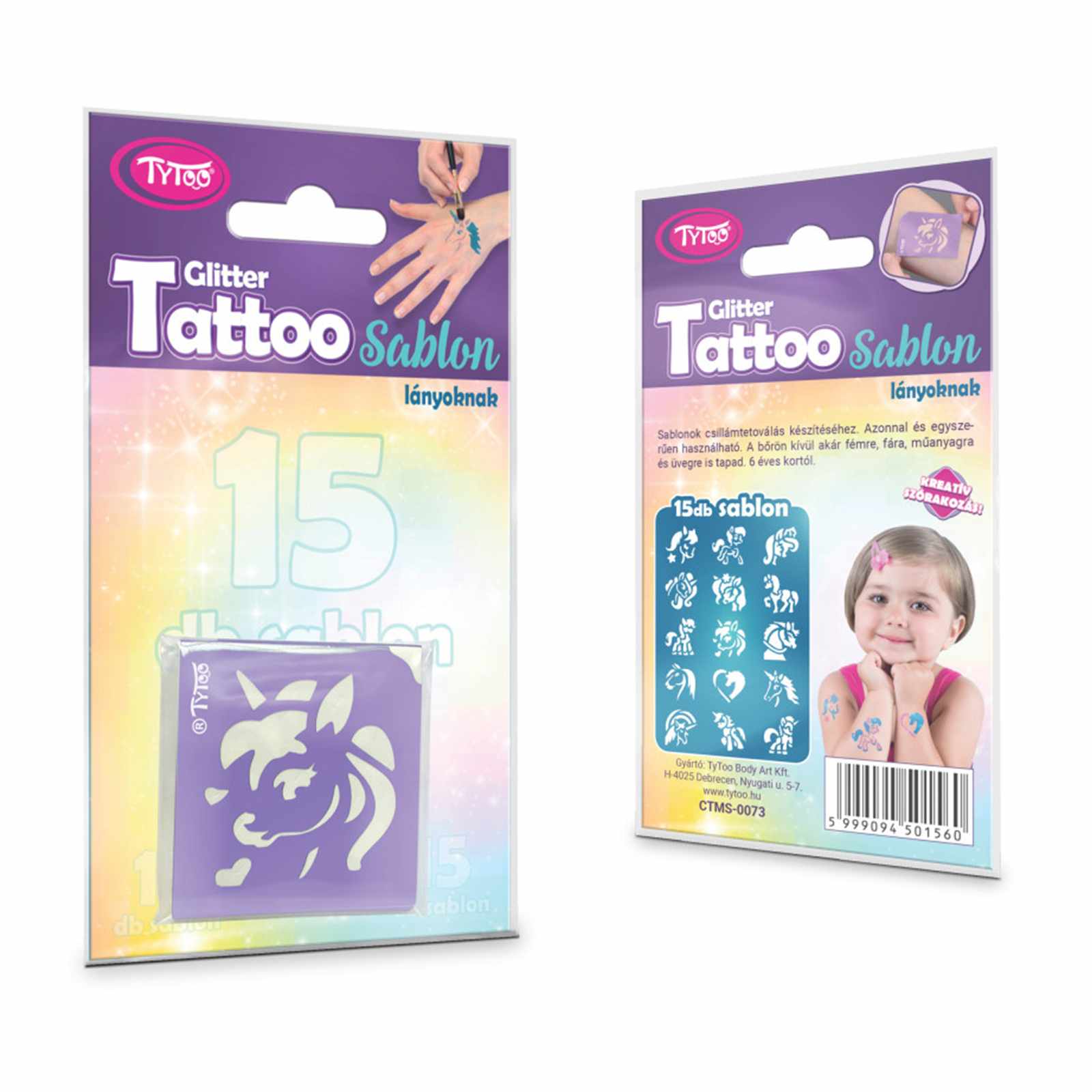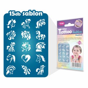 A csomagban található sablonok segítségével pónis, lovas, unikornisos csillámtetoválás mintákat készíthet, melyeket egyéb testfestéshez is felhasználhat. Ebben a csomagban olyan sablonokat talál, mint például pónis, lovas, unikornisos, melyekkel biztos örömöt szerez a gyerekeknek.