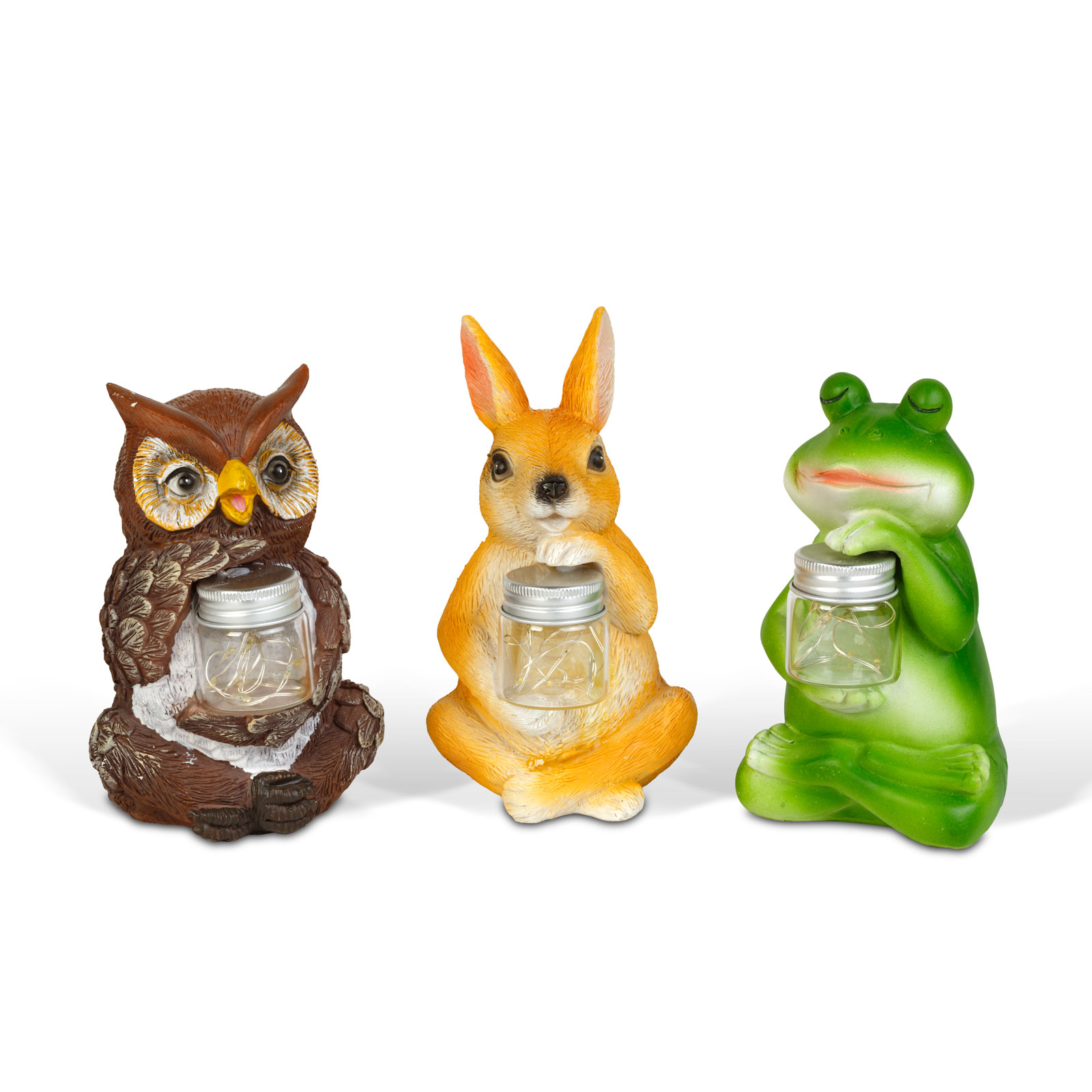 Tegye hangulatosabbá kertjét vagy teraszát ezekkel a szolár állatfigurákkal, melyek dekorációként és fényforrásként is megállják a helyüket. A háromféle kedves figura melegfehér fénnyel világít, amit 10 darab mikro LED biztosít. A beépített szolárpanel napközben energiát gyűjt, amit a mellékelt újratölthető akkumulátor tárol, így a világítás automatikusan bekapcsol sötétedéskor. Az állatformák esztétikus kiegészítői lehetnek virágágyásoknak, kerti utacskáknak vagy erkélyeknek is. A műgyanta és műanyag kombinációja biztosítja a hosszú élettartamot kültéri használat esetén.