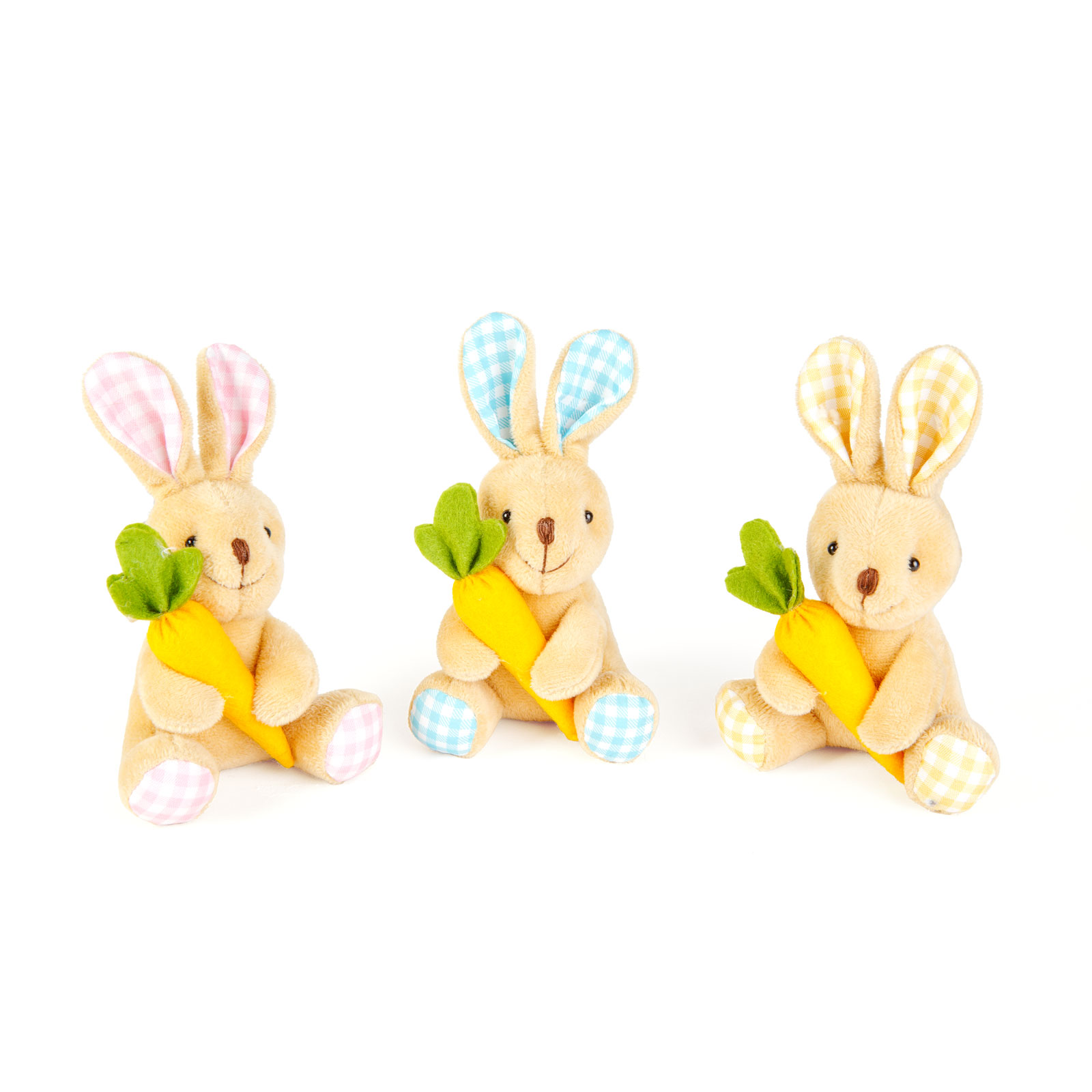 Vidám húsvéti hangulatot varázsolhat otthonába ezzel a bájos textil nyuszival! A puha plüss anyagból készült figura aranyos kialakításával és kedves részleteivel garantáltan mosolyt csal az arcokra. A 15 cm-es méretének köszönhetően tökéletes dekorációs elem lehet asztalon, polcon, ágyon vagy akár ajándékként is. A nyuszi háromféle változatban kapható: sárga, rózsaszín vagy kék, kockás fül- és tappancsmintázattal.