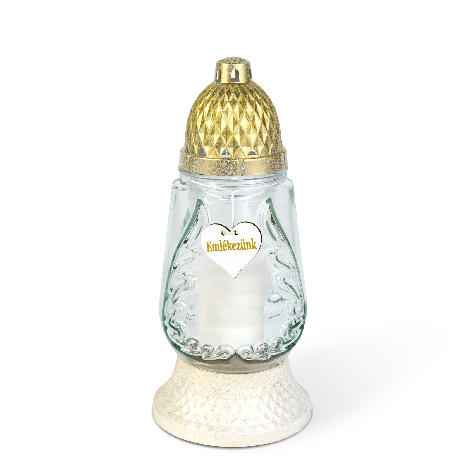 Üveg mécses – műanyag kupakkal – 26 cm – üveg szín: fehér – arany antik TW1019